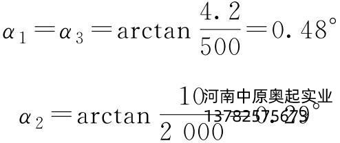 车轮群台车的*大偏斜角(图3-45),分三种情况考虑。**种:轨道1和轨道2或轨道3和轨道4之间因轨道高度差引起的车轮群台车的*大偏斜角α1、α3;第二种:轨道2和轨道3之间因轨道高度差引起的车轮群台车的*大偏斜角α2;第三种:轨道1和轨道4之间因轨道高度差累积引起的车轮群台车的*大偏斜角α。