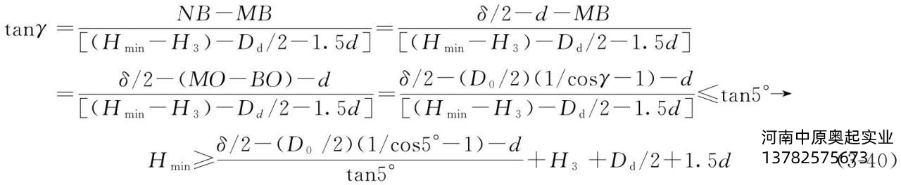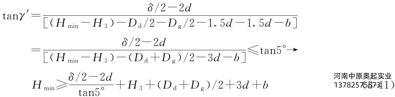 设卷筒钢丝绳出绳点*靠近卷筒*外面定滑轮中心线的距离为δ,吊钩组近似在卷筒和靠近*外面的定滑轮中心线的δ/2处,吊钩的起升极限距离Hmin可以从下式求出。