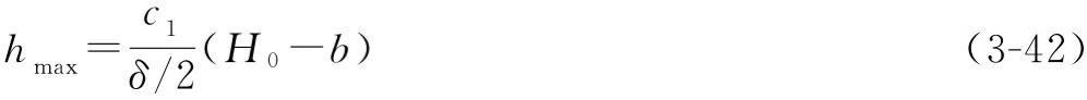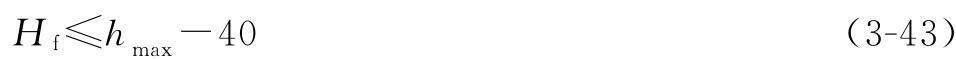 Hmin必须同时满足式(3-40)和式(3-41),此外,还必须考虑hmax值对钢丝绳的影响。当小车横梁过高,横梁靠近卷筒侧的腹板可能与钢丝绳干涉(图3-52)。从横梁滑轮轴到横梁*低端的距离Hf,推荐按式(3-43)校核,当Hf值大于hmax-40时,需将小车横梁里的滑轮组向右移布置,直到Hf满足小于或等于hmax-40值。